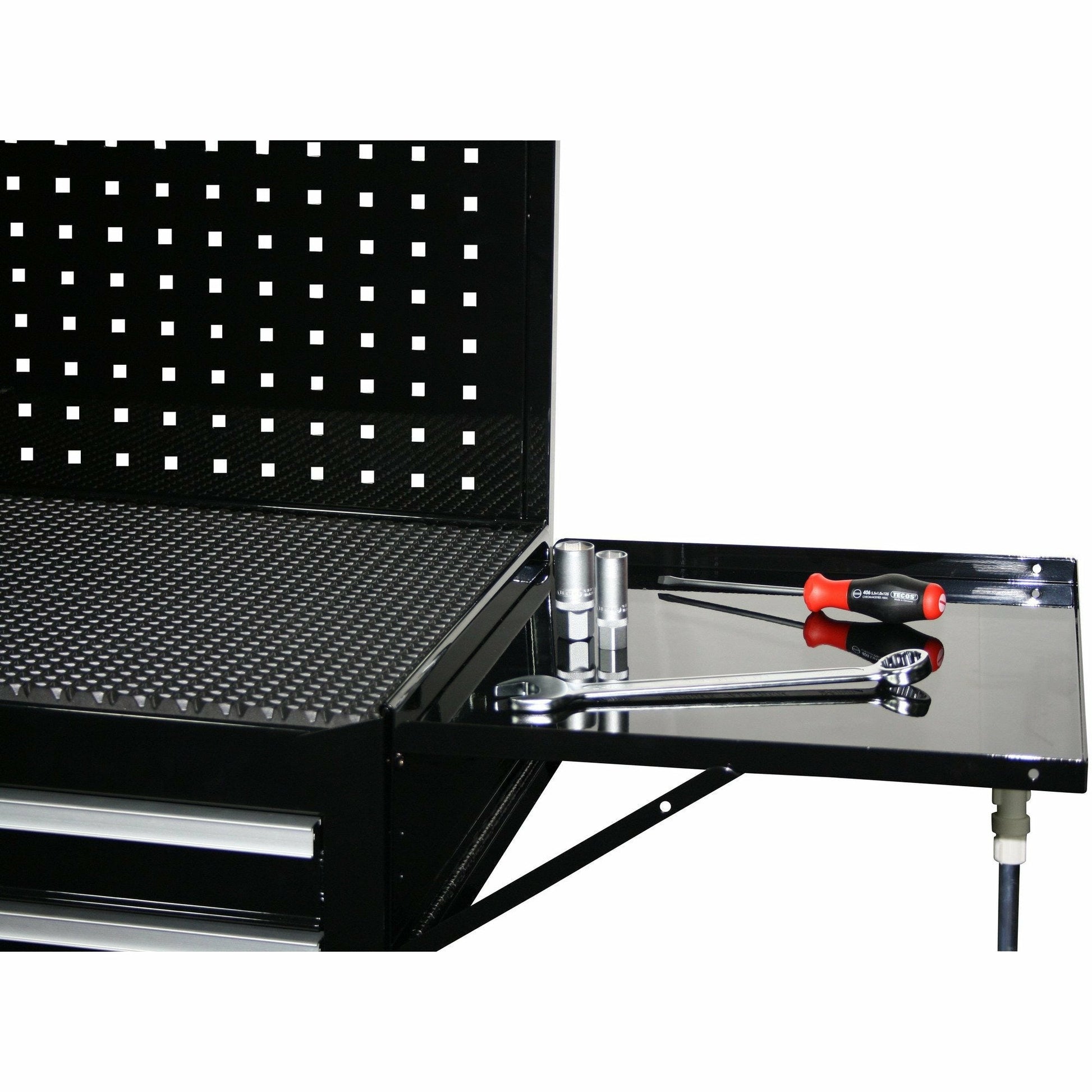 Praktisk sidehylle for montering på Tecos verktøyvogn, egnet for avsetting av verktøy, deler og tilbehør under arbeid. Gir økt arbeidsflate og bedre orden i verkstedet.