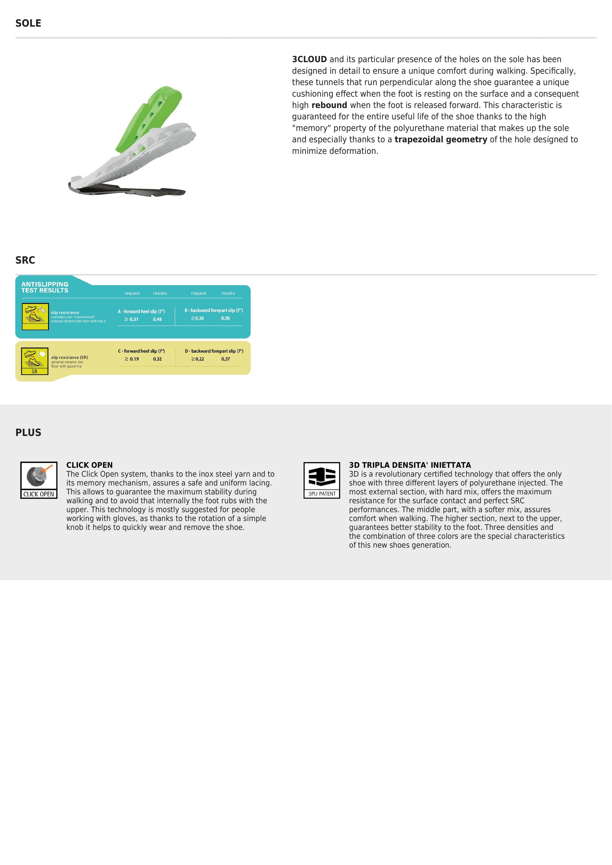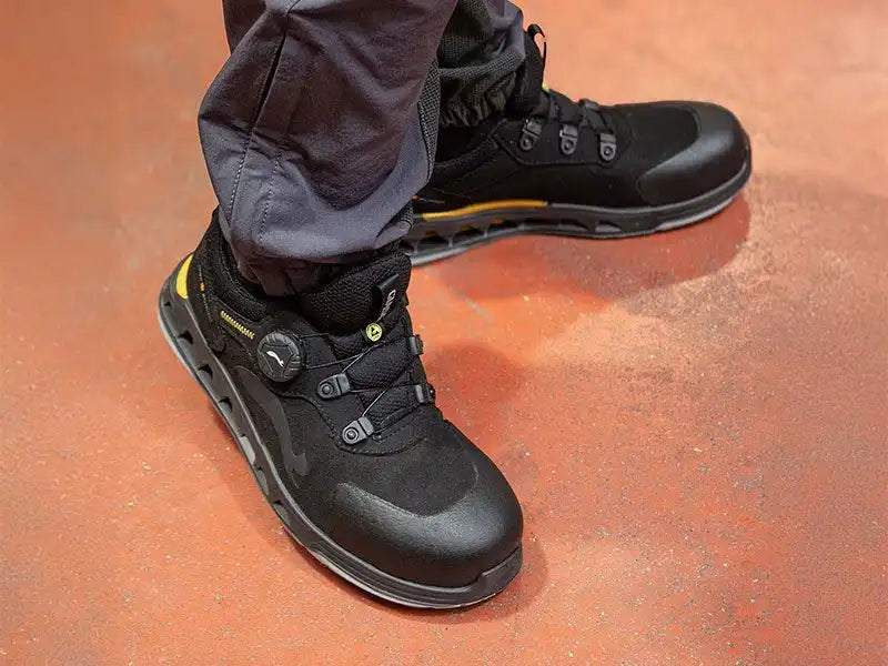 Yttersålen er støtabsorberende, oljeresistent og sklisikker, noe som gir godt grep på ulike underlag. Skoen er også antistatisk og har en anatomisk formet innersåle som er antibakteriell, pustende og svetteabsorberende. I tillegg har den avtagbare innleggssåler for enkel tilpasning og vedlikehold.