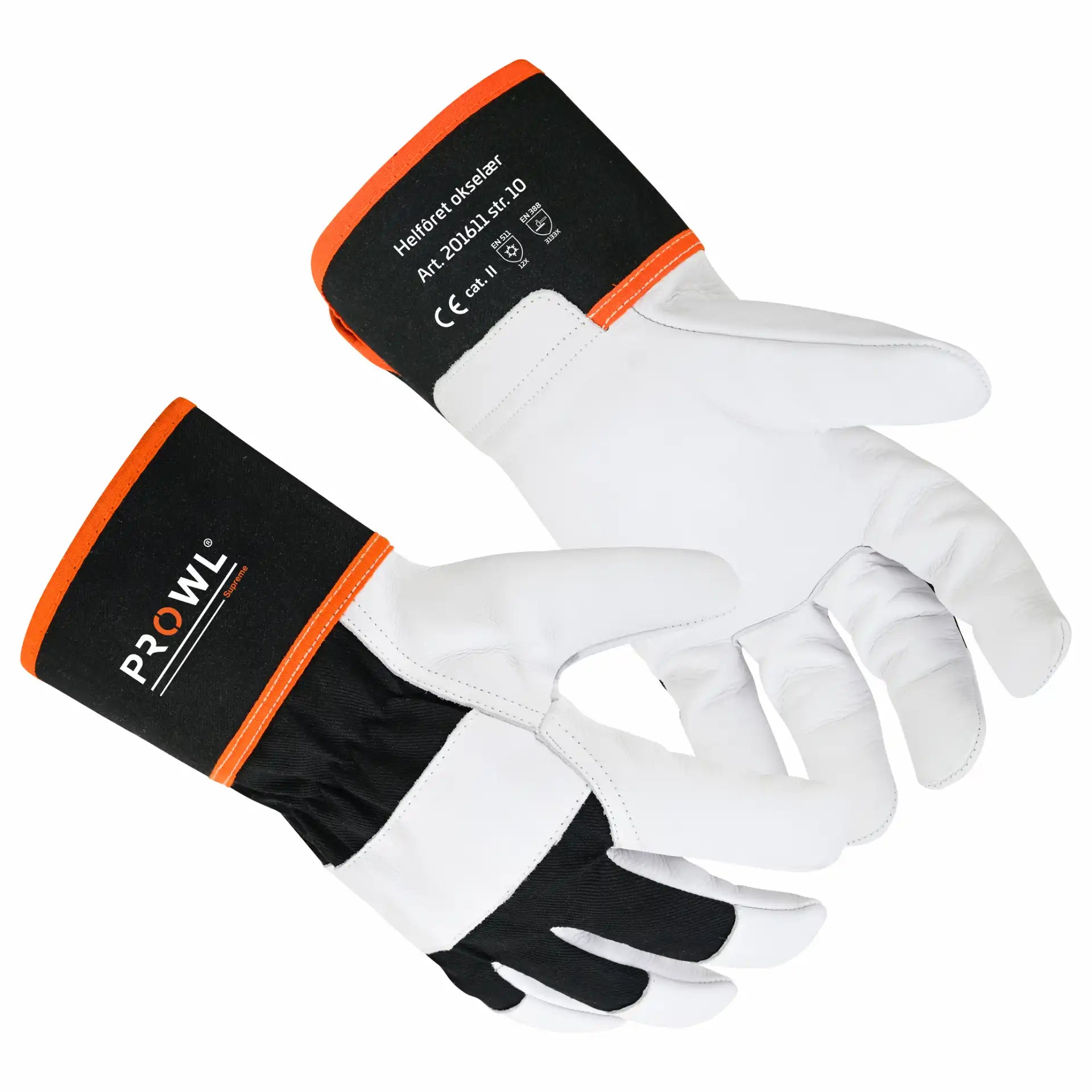 Helforet Okselær hanske med gummiert mansjett gir en overlegen kombinasjon av komfort og beskyttelse. Laget av slitesterkt okselær gir disse hanskene pålitelig ytelse og solid grep. Den gummierte mansjetten gir ekstra beskyttelse og holdbarhet, samtidig som den sikrer en sikker passform rundt håndleddet.