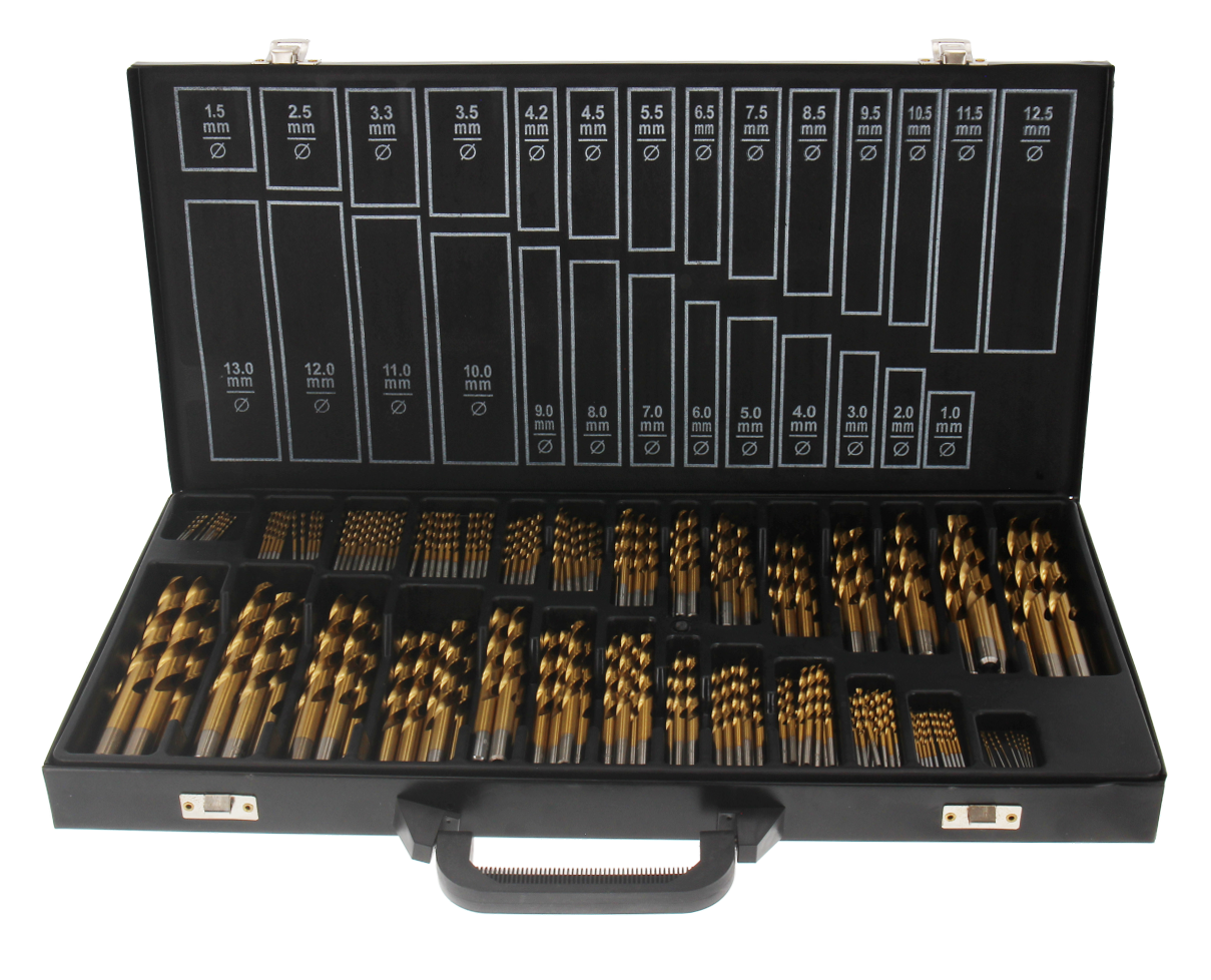 Et komplett metallborsett med 220 HSS TiN-belagte bor fra 1 til 13 mm. Produsert etter DIN 338 for høy dimensjonsnøyaktighet og presis geometri. TiN-belegget (Titanium Nitride) reduserer friksjon, øker slitestyrken og gir lengre levetid på borene.